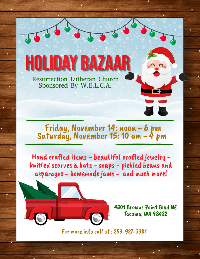 November 14 ( 12pm – 6pm) and 15th (10am – 4pm) – Holiday Bazaar (if you are interested in having a table space, please call the church office at 253-927-3301)